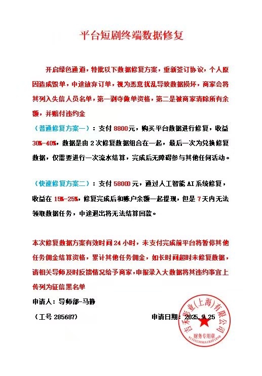 不久后,“导师”晒出了后台数据,声称为小组特批了修复方案。一种是每人支付8800元购买数据进行修复;另一种是每人支付58000元,利用AI系统修复,速度更快。群内其他成员都选择方案一。此前指责自己的成员,都积极完成每个步骤,将转账明细的截图发在群内,还提到去实地看过协议上落款的上海公司。王女士没看出破绽,抱着愧疚的心态同意选择了方案一。