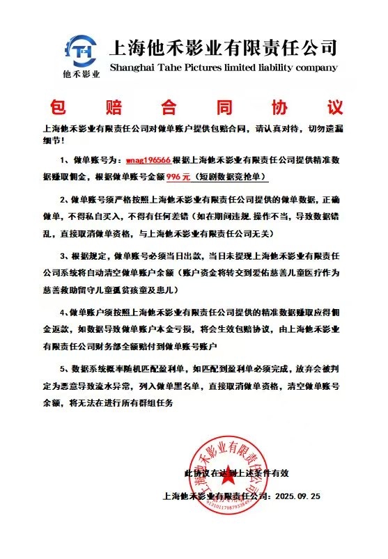第二天,“助理”抛来了新的“橄榄枝”,询问王女士是否要升级“学员”身份,如此每单可挣8.9元。具体操作相似,完成10单左右,王女士再次收到佣金88元。此后狗子28APP,报酬金额逐渐“升级”,任务还带有“限时”“中榜”等字眼,形成群内数百人“抢单”的声势。每次交办任务时,“助理”会发来一份落款为“上海他禾影业有限责任”公司的《包赔合同协议》,似乎为做任务提供了保障。王女士参与后收又到佣金282元。