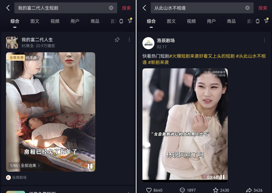 王女士被拉到一个数百人的“短剧热榜任务发布”群,一位自称“金牌导师”的账号很快下发了任务,要求成员每20分钟在任意社交平台搜索一个短剧名称,截图后上传到软件内,就能向“助理”拿到佣金。王女士按照要求在某短视频平台搜索了《我在的富二代人生》《从此山水不相逢》等短剧。每单返佣金4元左右,王女士先后做了16单后,通过微信或支付宝收到个人账户转来的几十元报酬。这让王女士逐渐相信,这份工作是为了帮助一些短剧增加搜索热度。