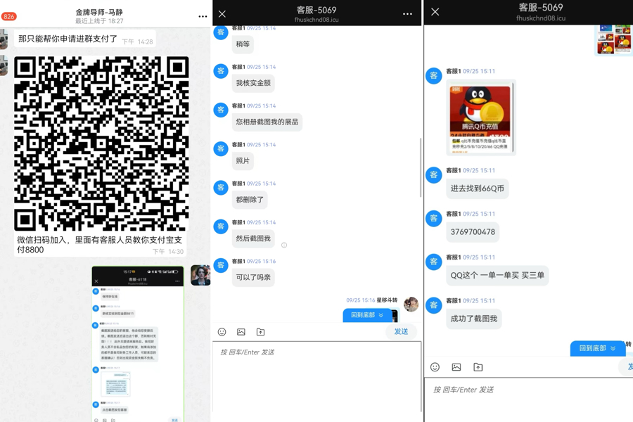 8800元的修复金额并没有在App里完成支付,王女士被要求用微信扫描一个二维码。扫码打开后是一个对话网页,有客服人员与其沟通。客服表示,需要她在闲鱼平台的一些商户上分15笔购买Q币,转入“3948858007”“369700478”两个QQ账号中,再将充值后的密钥截图传给客服。王女士照做后,客服还要求删除所有截图。等完成所有动作,小组群的老师带着一张所谓的“修复数据图”,再次要求成员支付38000元,王女士才意识到,修复是假,诈骗是真。