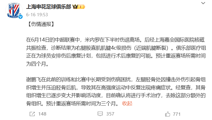 现在申花深受困扰的,是阵容不整。客场负于深圳新鹏城的联赛后,米内罗右腿股直肌肌腱4c级损伤(近端肌腱断裂),至少要到10月才能康复。谢鹏飞也因为接受手术将缺席三个月。缺少了攻击线上的两员大将,申花进攻端的人手只剩下路易斯、于汉超和刘诚宇,厚度明显不足。